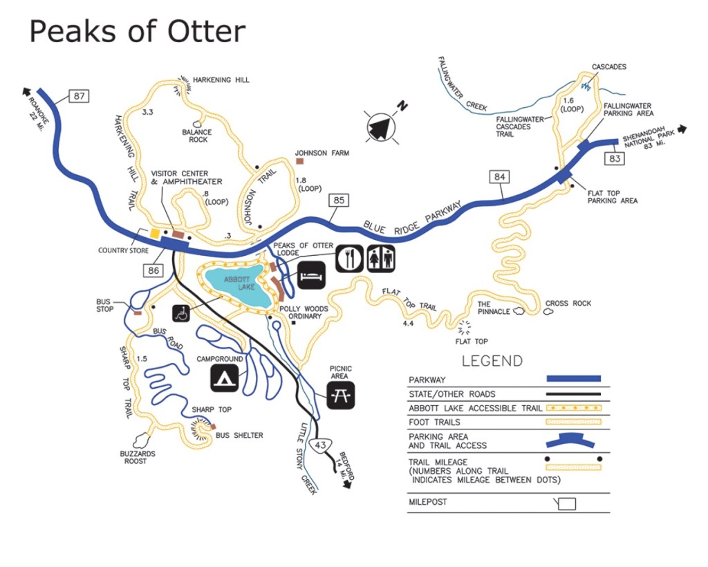 The Appalachian Trail, accessible along the scenic Blue Ridge Parkway, intersects with the Peaks of Otter Hiking Trails in Bedford County.