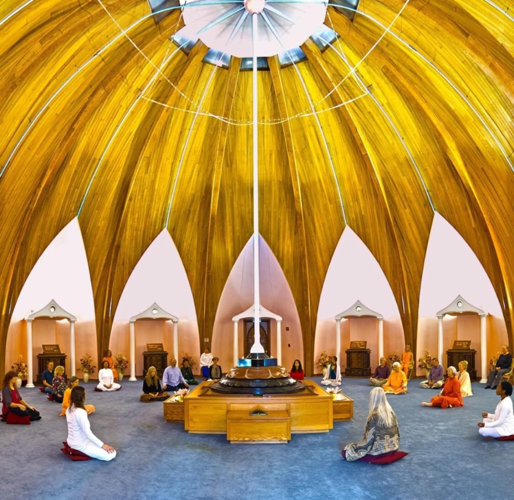 Meditation session in the Light of Truth Universal Shrine, from Facebook: Satchidananda Ashram, Yogaville.