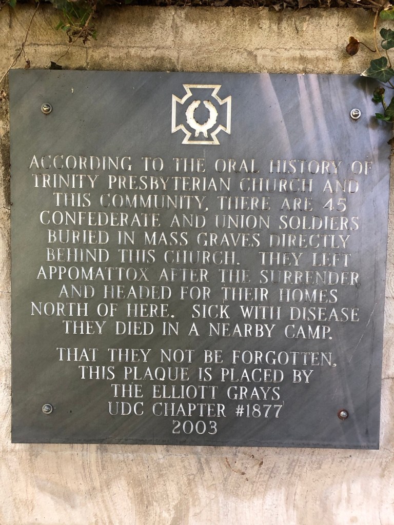 “According to the oral history of Trinity Presbyterian Church and this community, here are 45 Confederate and Union soldiers buried in mass graves directly behind this church. They left Appomattox after the surrender and headed for their homes north of here. Sick with disease, they died in a nearby camp. That they may not be forgotten, this plaque is placed by the Elliott Grays UDC Chapter #1877 2003″