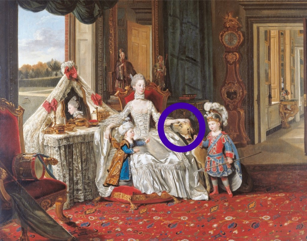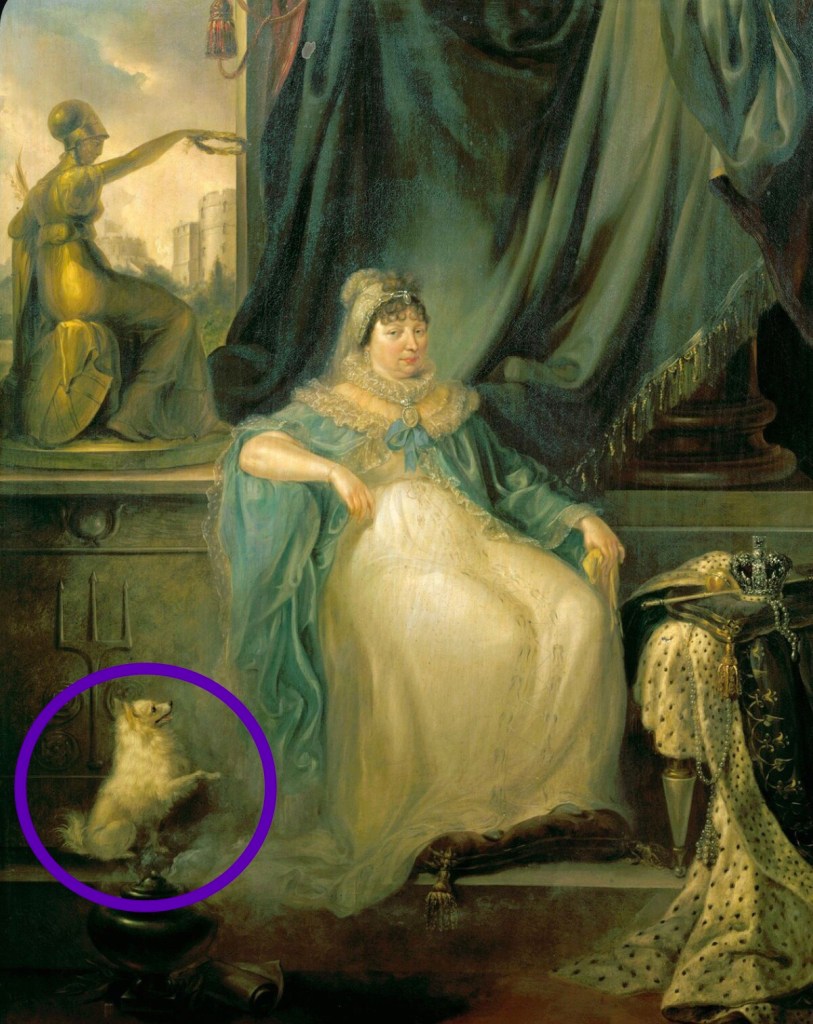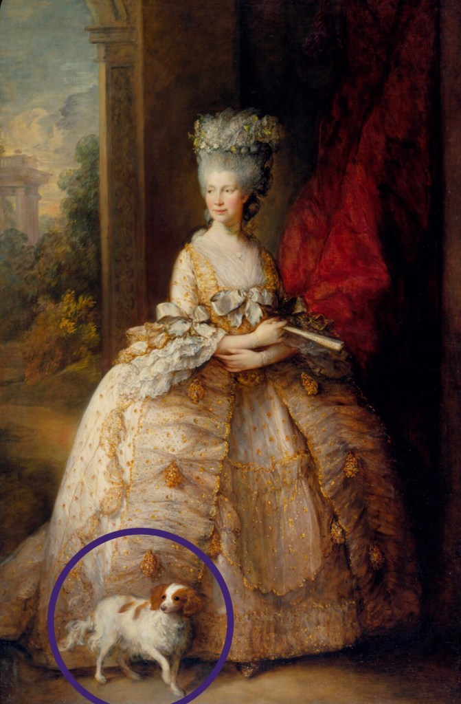 Thomas Gainsborough painted this portrait of Queen Charlotte of Mecklenburg-Strelitz and her canine companion in 1781.