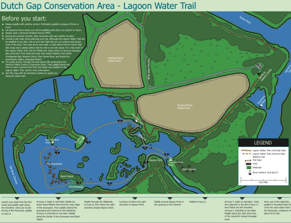 Dutch Gap’s Lagoon Water Trail includes sunken boats from a bygone era when a coal mine functioned here.